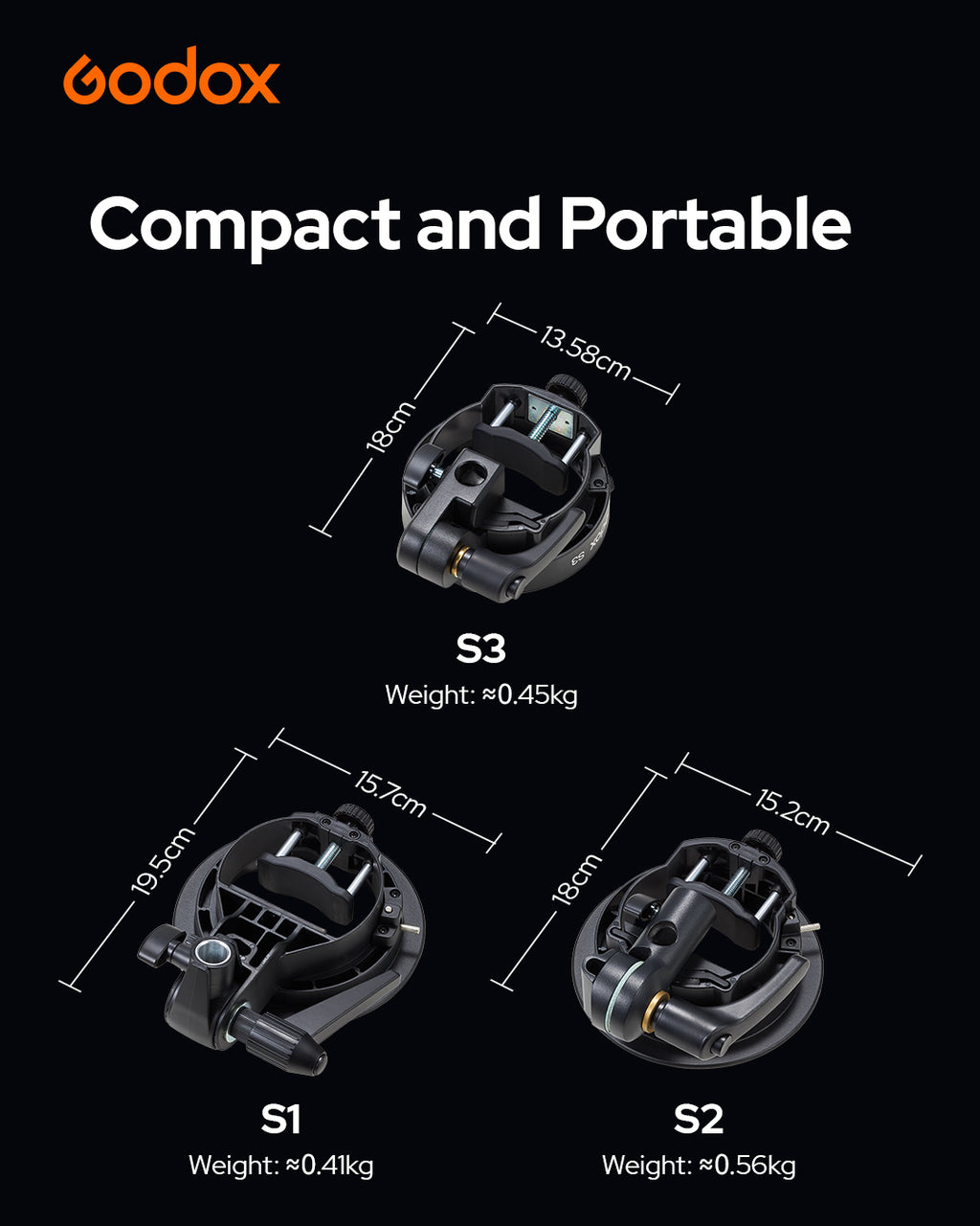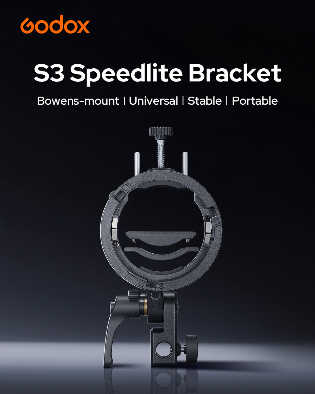 Godox S3 Flash Bracket for Bowens Mount is a compact, all-in-one solution designed to securely hold a wide range of Godox speedlights and outdoor flashes. With its truly universal clamp, the S3 supports both round-head and square-head flashes, making it ideal for photographers using multiple lighting systems.